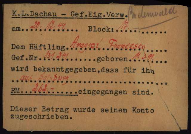 Documenti tratti da The Arolsen Archives online collections – 9963772 / Aragni Francesco (Dachau) e 5441472 / Aragni Francesco (Buchenwald).