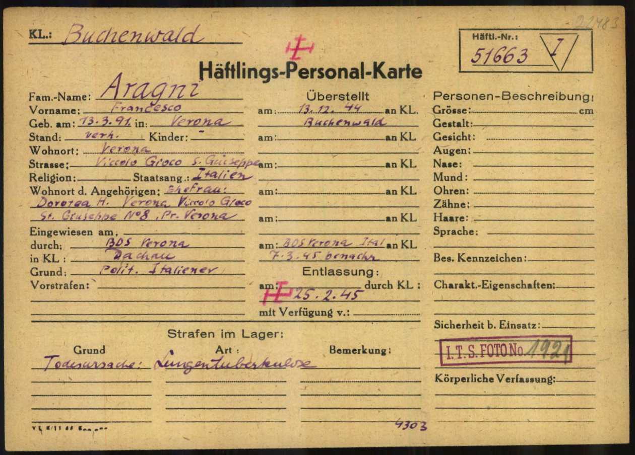 Aragni Francesco, nasce a Verona l’11 marzo 1891. Di mestiere muratore, risiede a Verona ed è coniugato con Dorotea H. Dopo l’arresto viene trasferito nel Campo di concentramento e transito di Bolzano (Polizei – und Durchgangslager Bozen). Su disposizione del BDS di Verona (Befehlshaber der Sicherheitspolizei und des Sicherheitsdienstes – Comandante della Polizia di Sicurezza e Servizi di Sicurezza), viene deportato nel Campo di concentramento di Dachau il 20 novembre 1944 (trasporto n° 104). All’arrivo, il 21 novembre 1944, gli viene dato il numero di matricola 131241, viene classificato come deportato per motivi precauzionali (SCH – Schutzhäftlinge) e viene assegnato al Blocco 17. Il 13 dicembre 1944 viene trasferito a Buchenwald dove viene immatricolato con il numero 51663. Muore a Bad Salzungen il 25 febbraio 1945. Nella seconda metà degli anni ’50 il Ministero della Difesa riesce a rintracciarne le Spoglie e le fa esumare e traslare nel Cimitero militare italiano d’onore di Francoforte sul Meno (Friedhof Westhausen) alla posizione tombale riquadro C, fila 8, tomba 15.
