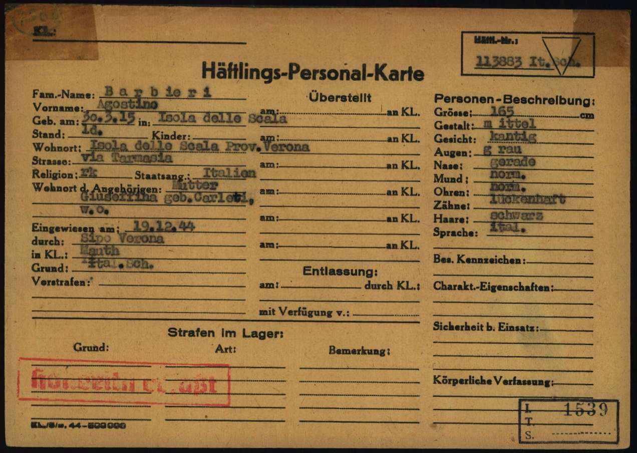 Barbieri Agostino, figlio di Giuseppina Carletti, nasce a Isola della Scala (Verona) il 30 marzo 1915. Di mestiere pittore e scultore, risiede a Isola della Scala ed è celibe. Viene arrestato a Isola della Scala il 21 novembre 1944. Detenuto a Verona, viene poi trasferito nel Campo di concentramento e transito di Bolzano (Polizei – und Durchgangslager Bozen). Su disposizione della Sipo di Verona (Sicherheitspolizei – Polizia di Sicurezza), viene deportato nel Campo di concentramento di Mauthausen il 14 dicembre 1944 (trasporto n° 111). All’arrivo, il 19 dicembre 1944, gli viene assegnato il numero di matricola 113883 e viene classificato come deportato per motivi precauzionali (SCH – Schutzhäftlinge). Il 21 febbraio 1945 viene trasferito a St. Aegyd (campo satellite di Mauthausen). Viene poi trasferito a Mauthausen il 4 aprile 1945. Viene liberato dai soldati dell’Esercito americano a Mauthausen il 5 maggio 1945.