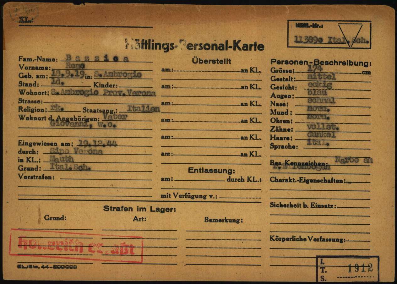 Bazzica Remo, figlio di Giovanni e Rosa Melchiori, nasce a Sant’Ambrogio di Valpolicella (Verona) il 18 settembre 1919. Di mestiere scalpellino, risiede a Sant’Ambrogio di Valpolicella ed è celibe. Partigiano della Brigata Pasubio, viene arrestato dalle SS e dai fascisti a Monte di Sant’Ambrogio (Verona) il 3 ottobre 1944 e detenuto nella caserma delle Camicie Nere nei pressi del Teatro Romano (sede dell’Ufficio Politico Investigativo – U.P.I.), nel Forte San Leonardo e presso il Palazzo INA (sede del Comando Generale SS e Polizia di Sicurezza – Befehlshaber der Sicherheitspolizei und des Sicherheitsdienst / B.d.S Italien). Viene poi trasferito nel Campo di concentramento e transito di Bolzano (Polizei – und Durchgangslager Bozen) il 31 ottobre 1944. Su disposizione della Sipo di Verona (Sicherheitspolizei – Polizia di Sicurezza), viene deportato nel Campo di concentramento di Mauthausen il 14 dicembre 1944 (trasporto n° 111). All’arrivo, il 19 dicembre 1944, gli viene assegnato il numero di matricola 113890 e viene classificato come deportato per motivi precauzionali (SCH – Schutzhäftlinge). Mestiere dichiarato o assegnato nel campo: calzolaio. Il 3 gennaio 1945 viene trasferito a Melk-Quarz (campo satellite di Mauthausen). Viene poi trasferito ad Ebensee (campo satellite di Mauthausen). Viene liberato dai soldati dell’Esercito americano a Ebensee il 6 o 8 maggio 1945 e rimpatriato il 15 giugno 1945.