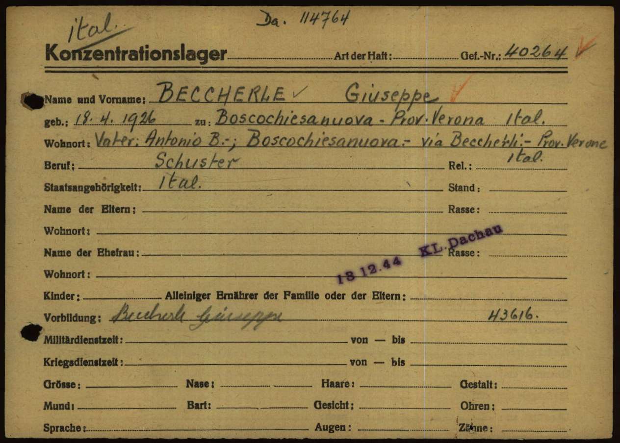 Beccherle o Becherle Giuseppe Cosma, figlio di Antonio e Margherita Florio, nasce a Bosco Chiesanuova (Verona) il 18 aprile 1926. Di mestiere contadino, risiede a Bosco Chiesanuova ed è celibe. Viene arrestato a Bosco Chiesanuova il 17 luglio 1944 e poi trasferito nel Campo di concentramento e transito di Bolzano (Polizei – und Durchgangslager Bozen). Su disposizione del BDS di Verona (Befehlshaber der Sicherheitspolizei und des SD – Comandante della Polizia di Sicurezza e Servizi di Sicurezza), viene deportato nel Campo di concentramento di Dachau il 5 ottobre 1944 (trasporto n° 90). All’arrivo, il 9 ottobre 1944, gli viene assegnato il numero di matricola 114764 e viene classificato come deportato per motivi precauzionali (SCH – Schutzhäftlinge). Il 13 dicembre 1944 viene trasferito a Buchenwald, dove viene immatricolato con il numero 40264 e gli viene assegnata la categoria di deportato per motivi politici (POL – Politisch). Mestiere dichiarato o assegnato: calzolaio. Viene poi trasferito all’Aussenkommando S3 Olga (nome in codice di un progetto di tunnel per la costruzione di armi segrete – campo satellite di Buchenwald) il 20 dicembre 1944 e immatricolato con numero 112474. Infine, viene trasferito a Ohrdruf (campo satellite di Buchenwald) il 15 gennaio 1945. Muore a Ohrdruf il 21 gennaio 1945 e viene sepolto nella stessa località in fossa comune.