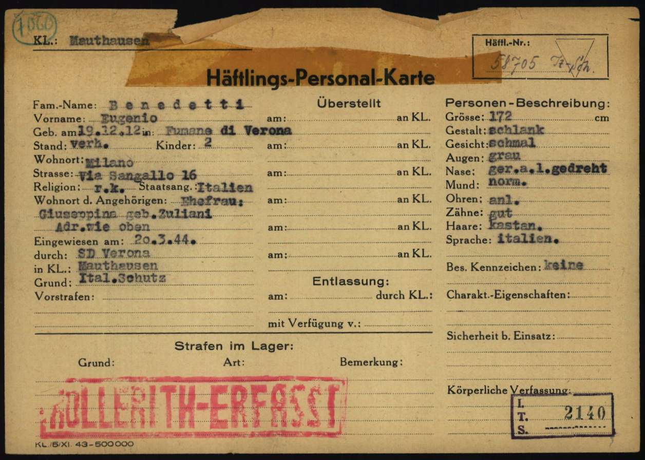 Benedetti Eugenio, nasce a Fumane (Verona) il 19 dicembre 1912. Di mestiere disegnatore tecnico, risiede a Milano, è coniugato con Giuseppina Zuliani e padre di due figli. Su disposizione del SD di Verona (Sicherheitsdienst – Servizio di Sicurezza delle SS), viene deportato nel Campo di concentramento di Mauthausen sul convoglio partito da Bergamo il 16 marzo 1944 (trasporto n° 34). All’arrivo, il 20 marzo 1944, gli viene assegnato il numero di matricola 58705 e viene classificato come deportato per motivi precauzionali (SCH – Schutzhäftlinge). Il 24 marzo 1944 viene trasferito a Gusen (campo satellite di Mauthausen). Viene poi trasferito a Schwechat (campo satellite di Mauthausen) il 16 aprile 1944. Viene liberato dai soldati dell’Esercito americano a Mauthausen il 5 maggio 1945.