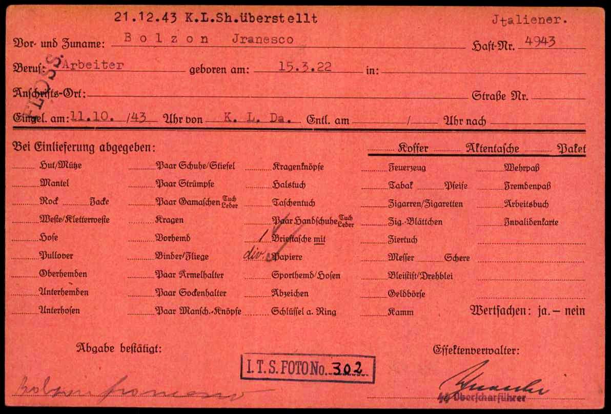 Documenti tratti da The Arolsen Archives online collections – 96334034 / Bolzon o Bolzan Francesco (Dachau), 10830276 / Bolzon o Bolzan Francesco (Flossenbürg) e 5576411 / Bolzon o Bolzan Francesco (Buchenwald).
