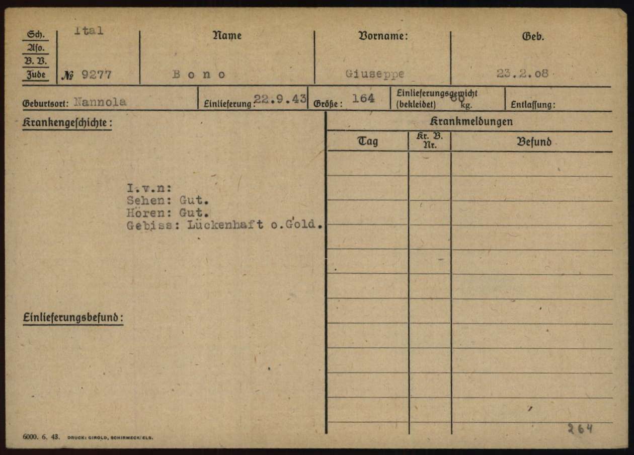 Documenti tratti da The Arolsen Archives online collections – 3151029 / Bono Giuseppe (Natzweiler) e 3151030 / Bono Giuseppe (Natzweiler).