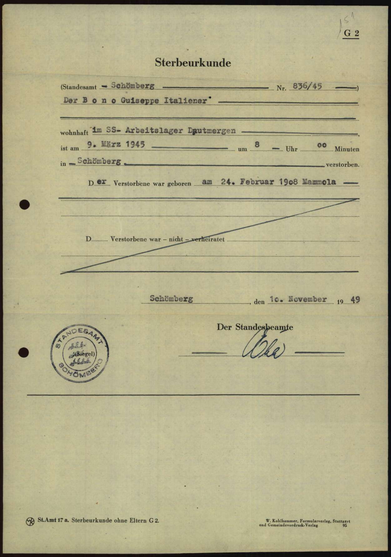 Bono Giuseppe, nasce a Mammola (Reggio Calabria) il 23 febbraio 1908. Risiede a Peschiera del Garda (Verona). Dopo l’arresto viene detenuto nel Reclusorio militare di Peschiera del Garda (Verona). Su disposizione della Kripo di Monaco di Baviera (Kriminalpolizei – Polizia criminale), viene deportato nel Campo di concentramento di Dachau sul convoglio partito da Peschiera del Garda il 20 settembre 1943 (trasporto n° 2). All’arrivo, il 22 settembre 1943, gli viene assegnato il numero di matricola 53816 e viene classificato come deportato ai lavori forzati (AZR – Arbeitszwang Reich). Viene trasferito a Dautmergen (campo satellite dipendente da Natzweiler) tra il 21 e il 26 marzo 1944, dove gli viene assegnato il numero di matricola 9277. Muore a Schomberg-Dautmergen il 9 marzo 1945.