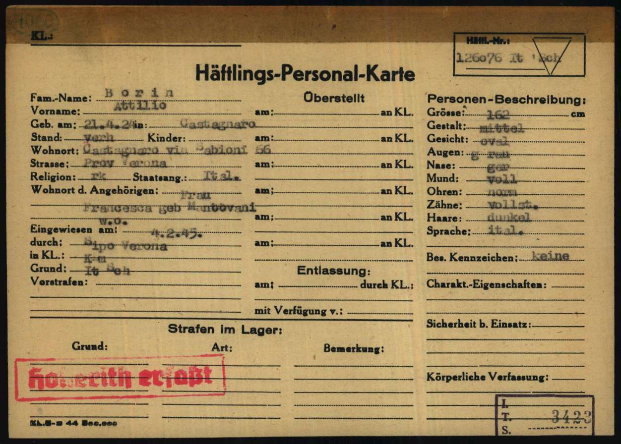 Documenti tratti da The Arolsen Archives online collections – 1370130 / Borin Attilio (Mauthausen) e da 1370131 / Borin Attilio (Gusen).