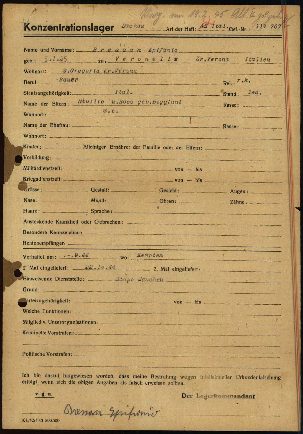 Bressan Epifanio, figlio di Navilio e Rosa Boggiani, nasce a Veronella (Verona) il 5 gennaio 1925. Di mestiere contadino, risiede a Veronella – frazione San Gregorio (Verona) ed è celibe. Arrestato perché renitente alla leva, viene detenuto alle Casermette di Montorio (Verona), viene poi deportato come lavoratore coatto a Burghausen (Baviera) dal 13 luglio 1944 al 24 agosto 1944 ed impiegato per la Wacker Werk (industria chimica) ad Altötting, Mühldorf am Inn e Kempten / Allgäu (Baviera). Viene poi arrestato a Kempten (Germania) nel settembre del 1944. Su disposizione della Stapo di Monaco di Baviera (Staatspolizei – Polizia dello Stato), viene deportato nel Campo di concentramento di Dachau. All’arrivo, il 22 ottobre 1944 gli viene dato il numero di matricola 117767, viene classificato come deportato per motivi precauzionali (SCH – Schutzhäftlinge) e viene assegnato al Blocco 30. Viene liberato dai soldati dell’Esercito americano a Dachau il 29 aprile 1945.