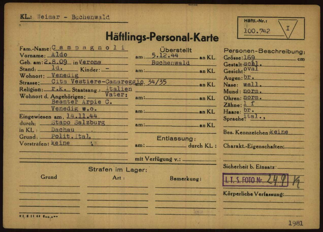 Campagnoli Aldo, figlio di Arpie (?) ed Eleonora Cubi, nasce a Verona il 2 settembre 1909. Risiede a Venezia in Sestriere Canareggio 34/35. Di mestiere cuoco e cameriere, è celibe. Marinaio della Regia Marina, viene arrestato a Venezia il 5 febbraio 1944. Detenuto a Venezia per tre mesi, viene poi trasfrito a Salisburgo (Austria) e detenuto per sei mesi. Su disposizione della Stapo di Salisburgo – Austria – (Staatspolizei – Polizia dello Stato), viene deportato nel Campo di concentramento di Dachau. All’arrivo, il 14 novembre 1944, gli viene assegnato il numero di matricola 126514 e viene classificato come deportato per motivi precauzionali (SCH – Schutzhäftlinge). Il 4 dicembre 1944 viene trasferito a Buchenwald dove arriva il 5 dicembre 1944. Viene immatricolato con il numero 100742 e gli viene assegnata la categoria di deportato per motivi politici (POL – Politisch). Viene poi trasferito a Ohrdruf (campo satellite di Buchenwald), dove arriva il 12 gennaio 1945 e viene immatricolato con il numero 109045. Il 13 dicembre 1944, viene trasferito all’Aussenkommando S3 Olga (nome in codice di un progetto di tunnel per la costruzione di armi segrete – campo satellite di Buchenwald). Viene liberato a Buchenwald il 13 aprile 1945.