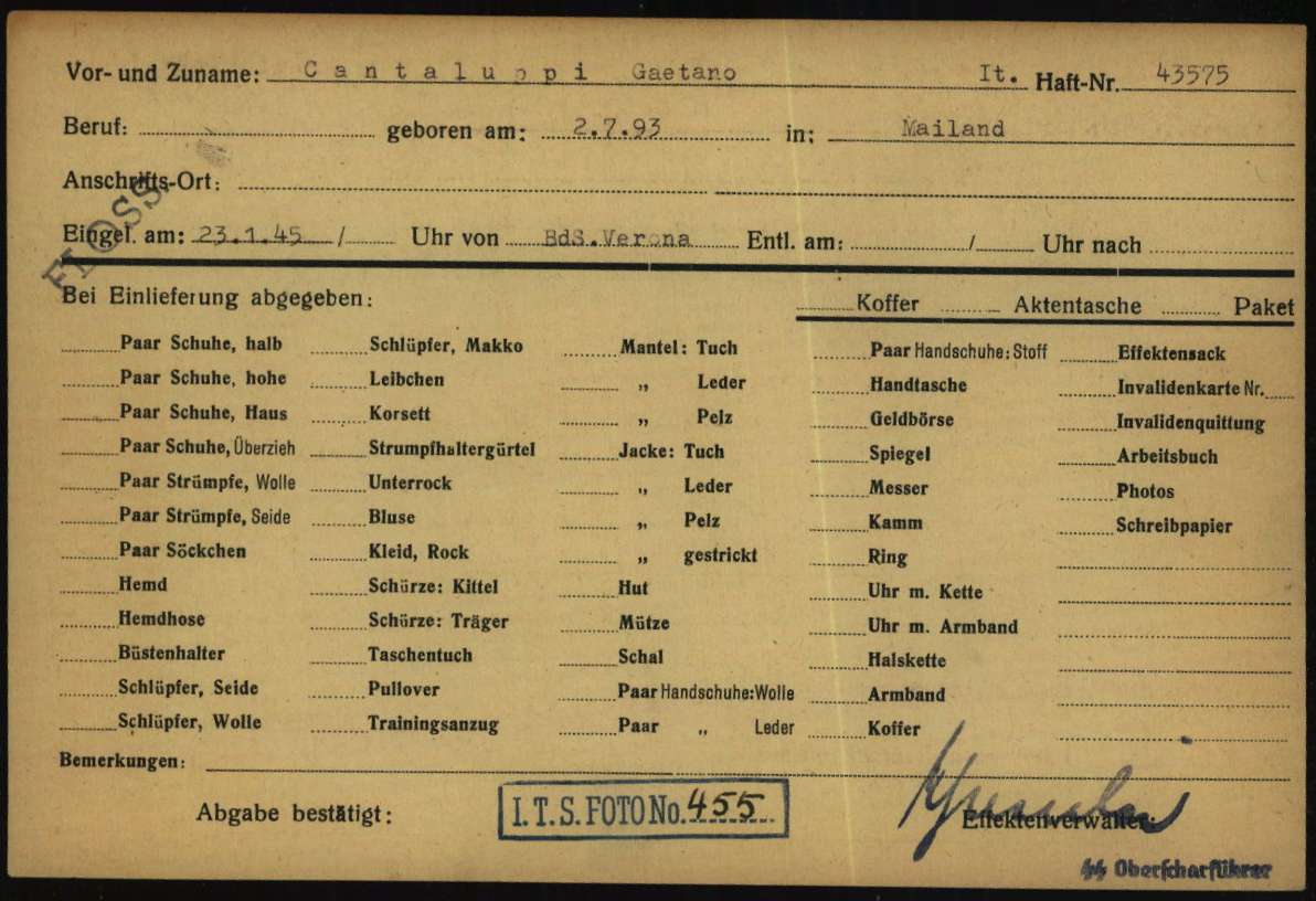 Documenti tratti da The Arolsen Archives online collections – 10838679 / Cantaluppi Gaetano (Flossenbürg).
