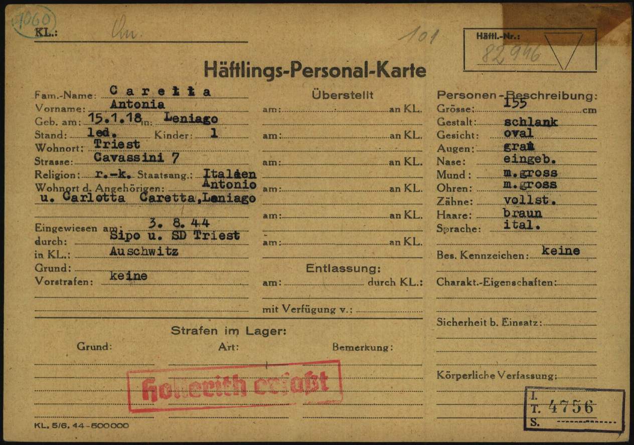 Documenti tratti da The Arolsen Archives online collections – 1867235 / Caretta o Carretta Antonia o Antonietta (Mauthausen).