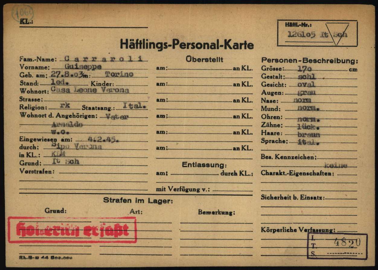 Carraroli Giuseppe, figlio di Arnaldo, nasce a Torino il 27 agosto 1903. Di mestiere medico, risiede a Casaleone (Verona) ed è celibe. Viene arrestato a Verona e poi trasferito nel Campo di concentramento e transito di Bolzano (Polizei – und Durchgangslager Bozen). Su disposizione della Sipo di Verona (Sicherheitspolizei – Polizia di Sicurezza), viene deportato nel Campo di concentramento di Mauthausen il 1° febbraio 1945 (trasporto n° 119). All’arrivo, il 4 febbraio 1945, gli viene assegnato il numero di matricola 126105 e viene classificato come deportato per motivi precauzionali (SCH – Schutzhäftlinge). Viene poi trasferito a Solvay-Ebensee (campo satellite di Mauthausen). Muore a Ebensee il 18 aprile 1945 e viene sepolto a Ebensee in fossa comune.