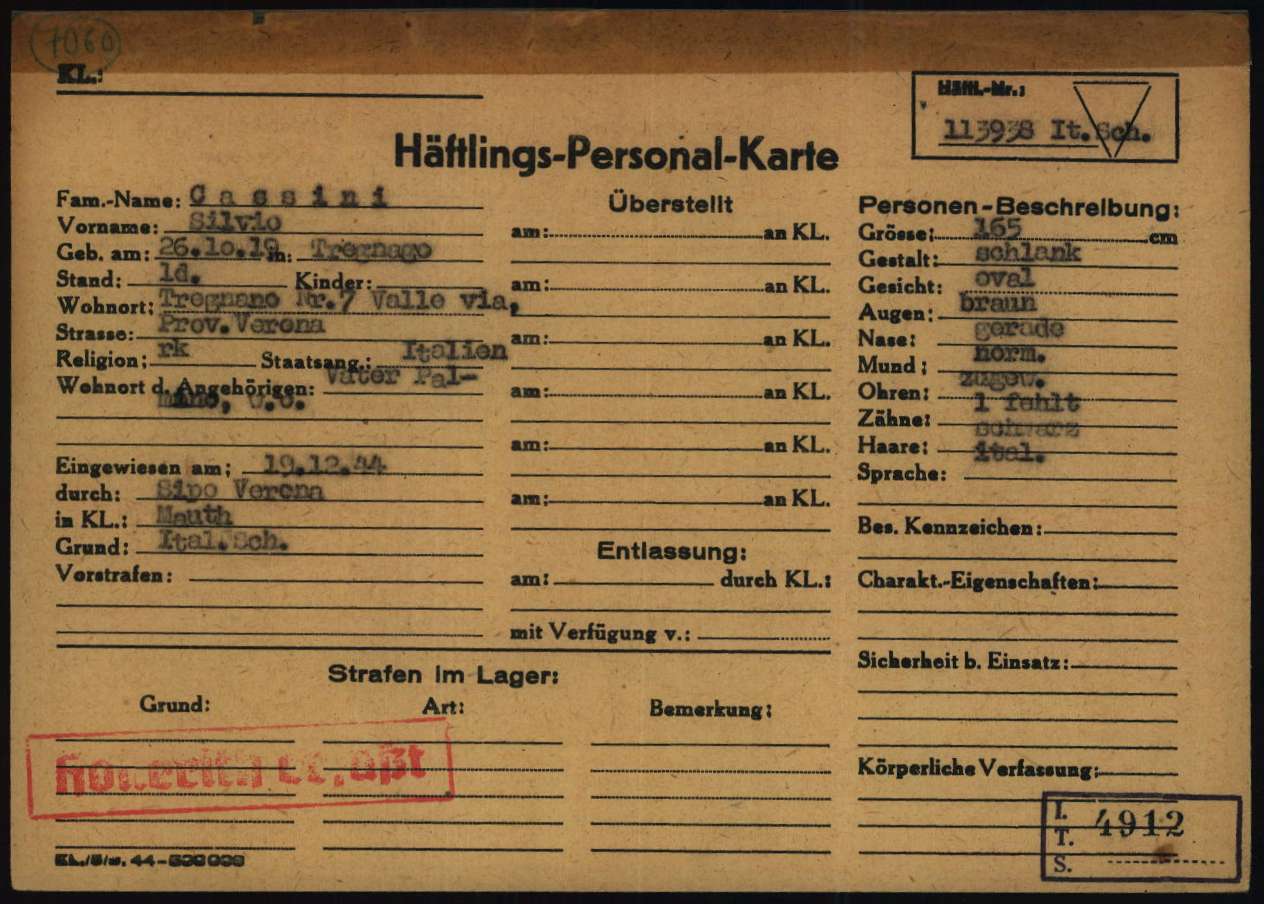 Documenti tratti da The Arolsen Archives online collections – 1387884 / Cassini Silvio (Mauthausen).