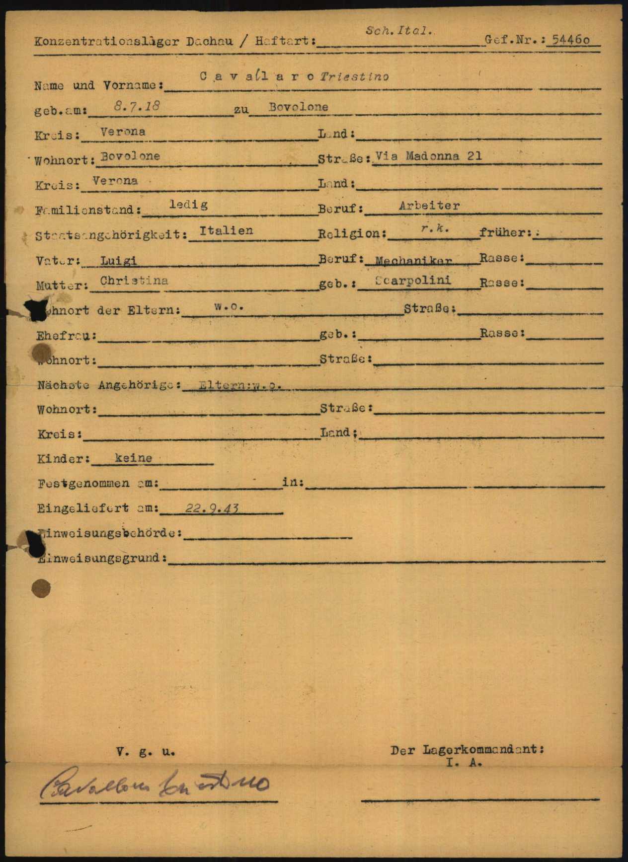 Documenti tratti da The Arolsen Archives online collections – 10004272 / Cavallaro Triestino (Dachau).