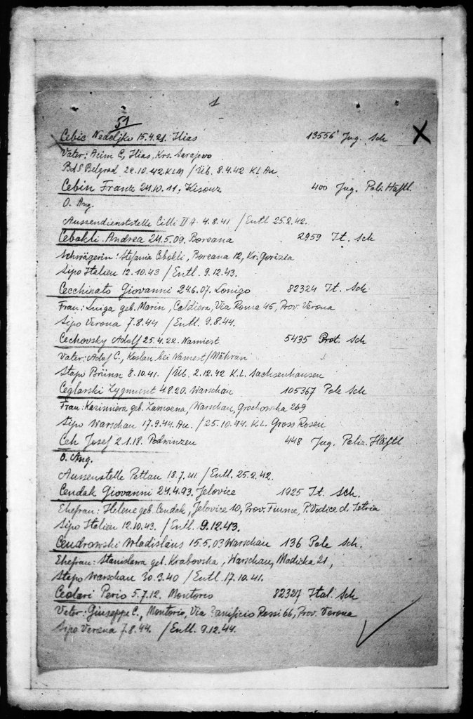 Note: nei documenti originali di Mauthausen risulta, assieme ad altri deportati con numeri di matricola vicini, “Entlassen” – rilasciato – in data 9 agosto 1944. (nda. Sul documento originale del Ceolari risulta come data del rilascio/trasferimento 9 dicembre 1944 per un probabile errore di trascrizione, visto che tutti gli altri deportati vennero trasferiti in data 9 agosto 1944).