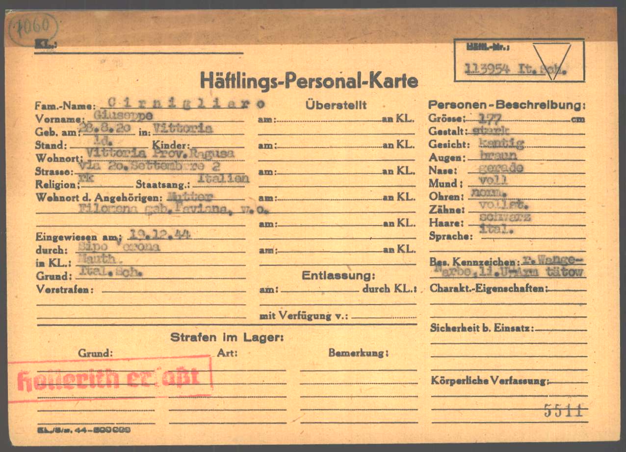 Cirnigliaro Giuseppe, figlio di Salvatore e Filomena Faviana, nasce a Vittoria (Ragusa) il 28 agosto 1920. Di mestiere maniscalco, risiede a Vittoria ed è celibe. Partigiano della Divisione Pasubio, viene arrestato a Sant’Ambrogio di Valpolicella (Verona) il 20 ottobre 1944 e detenuto presso il Palazzo INA (sede del Comando Generale SS e Polizia di Sicurezza – Befehlshaber der Sicherheitspolizei und des Sicherheitsdienst / B.d.S Italien). Viene poi trasferito nel Campo di concentramento e transito di Bolzano (Polizei – und Durchgangslager Bozen) il 27 ottobre 1944. Su disposizione della Sipo di Verona (Sicherheitspolizei – Polizia di Sicurezza), viene deportato nel Campo di concentramento di Mauthausen il 14 dicembre 1944 (trasporto n° 111). All’arrivo, il 19 dicembre 1944, gli viene assegnato il numero di matricola 113954 e viene classificato come deportato per motivi precauzionali (SCH – Schutzhäftlinge). Il 20 gennaio 1945 viene ricoverato presso l’infermeria di Mauthausen (Revier) e dimesso il 5 febbraio 1945. Viene liberato dai soldati dell’Esercito americano a Mauthausen il 5 maggio 1945.
