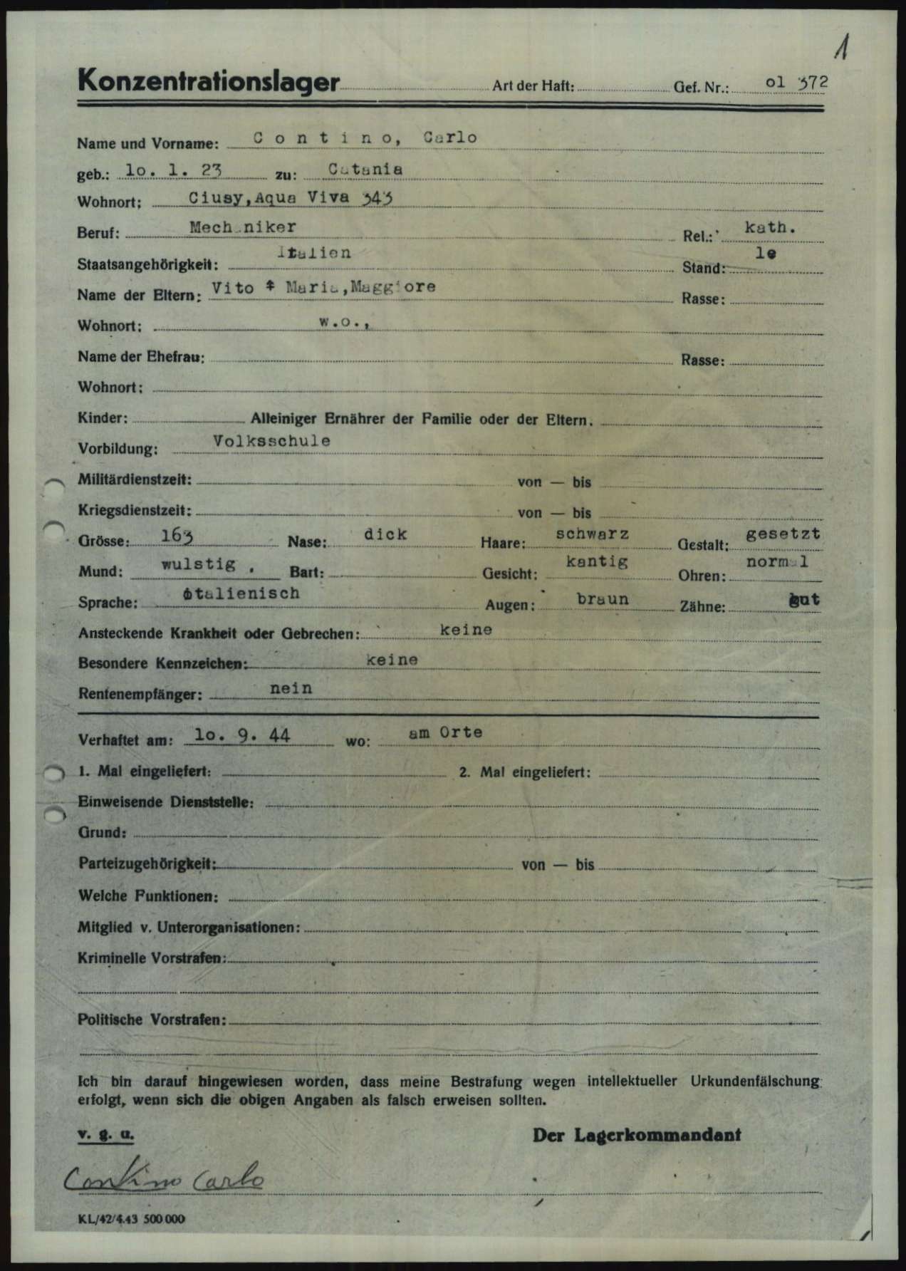 Contino Carlo, figlio di Vito e Maria Maggiore, nasce a Catania il 10 gennaio 1923. Di mestiere meccanico e tornitore, risiede ad Acquaviva (Siena) ed è celibe. Viene arrestato a Verona il 10 settembre 1944 e trasferito nel Campo di concentramento e transito di Bolzano (Polizei – und Durchgangslager Bozen). Su disposizione del BDS di Verona (Befehlshaber der Sicherheitspolizei und des SD – Comandante della Polizia di Sicurezza e Servizi di Sicurezza), viene poi deportato nel Campo di concentramento di Dachau il 5 ottobre 1944 (trasporto n° 90). All’arrivo, il 9 ottobre 1944, gli viene assegnato il numero di matricola 113317 e viene classificato come deportato per motivi precauzionali (SCH – Schutzhäftlinge). Il 31 ottobre 1944 viene trasferito a Stutthof, dove viene immatricolato con il numero 01372. Viene liberato a Stutthof.