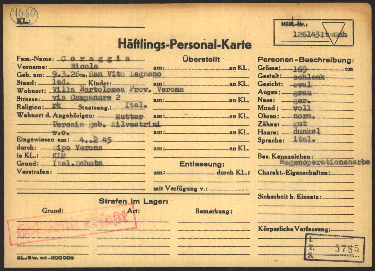 Coraggia o Corraggia Nicola, figlio di Gioacchino e Teresa o Teresia Silvestri o Silvestrini, nasce a San Vito di Legnago (Verona) il 9 marzo 1926. Di mestiere calzolaio, risiede a Villa Bartolomea (Verona) ed è celibe. Viene arrestato a Villa Bartolomea e poi trasferito nel Campo di concentramento e transito di Bolzano (Polizei – und Durchgangslager Bozen). Su disposizione della Sipo di Verona (Sicherheitspolizei – Polizia di Sicurezza), viene deportato nel Campo di concentramento di Mauthausen il 1° febbraio 1945 (trasporto n° 119). All’arrivo, il 4 febbraio 1945, gli viene assegnato il numero di matricola 126143 e viene classificato come deportato per motivi precauzionali (SCH – Schutzhäftlinge). Il 17 febbraio 1945 viene trasferito a Gusen (campo satellite di Mauthausen). Muore a Gusen il 10 aprile 1945 e viene sepolto nella stessa località in fossa comune.