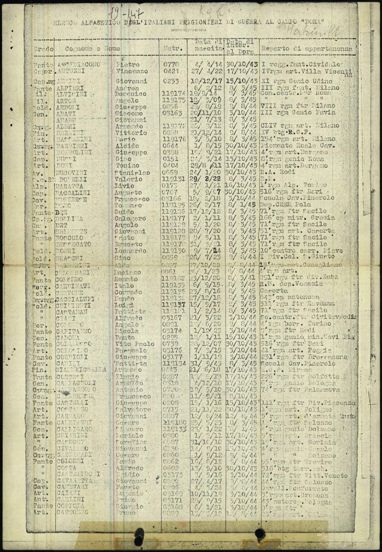 Cordioli Giuseppe, nasce a Mozzecane (Verona) il 30 ottobre 1919. Soldato del 231° Reggimento di Fanteria Bressanone. Viene arrestato a Bressanone il 9 settembre 1943 e deportato a Dora il 3 ottobre 1944. Gli viene assegnato il numero di matricola 03177 e viene classificato come prigioniero di guerra (KGF – Kriegsgefangene). Liberato, viene rimpatriato il 20 agosto 1945.
