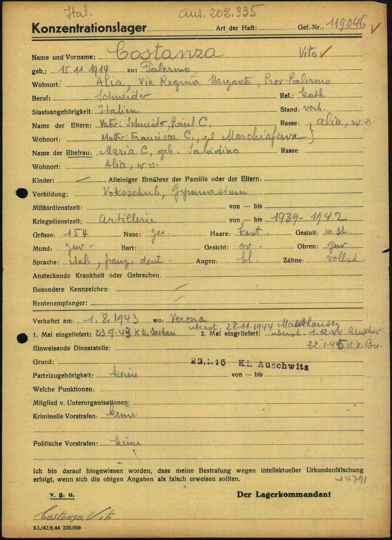 Costanza Vito, nasce a Alia (Palermo) il 15 novembre 1914. Coniugato, risiede ad Alia. Viene arrestato a Verona il 1° agosto 1943 e detenuto nel Reclusorio militare di Peschiera del Garda (Verona). Su disposizione della Kripo di Monaco di Baviera (Kriminalpolizei – Polizia criminale), viene deportato nel Campo di concentramento di Dachau sul convoglio partito da Peschiera del Garda il 20 settembre 1943 (trasporto n° 2). All’arrivo, il 22 settembre 1943, gli viene assegnato il numero di matricola 55084 e viene classificato come deportato ai lavori forzati (AZR – Arbeitszwang Reich). Mestiere dichiarato all’atto dell’immatricolazione (o mestiere assegnato nel campo): meccanico e sarto. Viene trasferito a Mauthausen il 2 dicembre 1943, dove gli viene assegnato il numero di matricola 40522. Viene poi trasferito a Schwechat (campo satellite dipendente da Mauthausen). Viene successivamente trasferito a Mauthausen, Auschwitz ed infine Buchenwald, dove arriva il 22 gennaio 1945 e dove gli viene assegnato il numero di matricola 119046. Rientra a Dachau dove muore in data ignota.