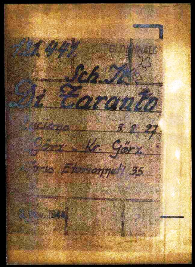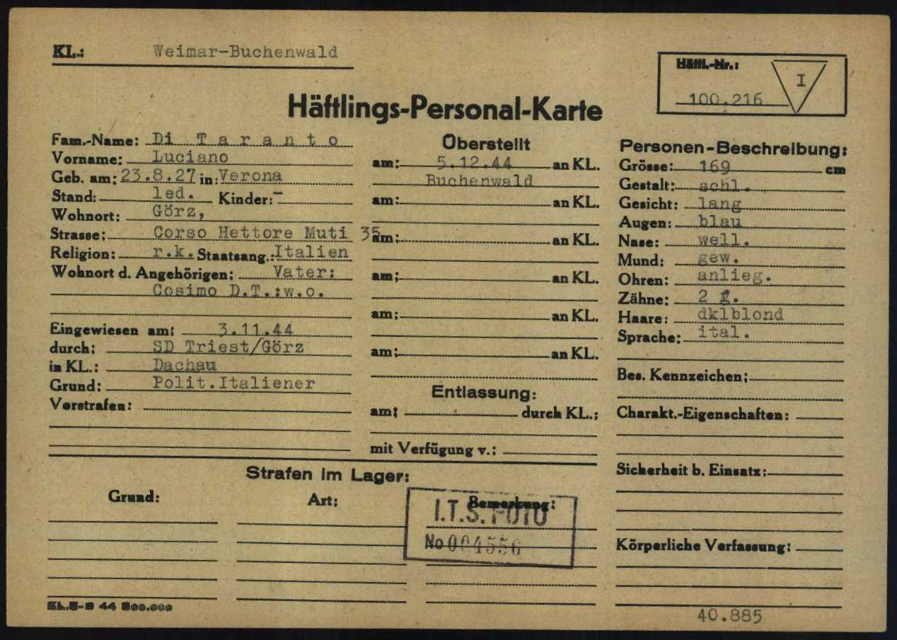 Di Taranto Luciano, figlio di Cosimo e Ester Di Narda, nasce a Verona il 3 agosto 1927. Studente di scuola superiore, risiede a Gorizia ed è celibe. Viene arrestato a Gorizia il 25 agosto 1944. Su disposizione dalla Sipo di Trieste/Gorizia (Sicherheitspolizei – Polizia di Sicurezza), viene deportato nel Campo di concentramento di Dachau sul convoglio partito da Trieste il 1° novembre 1944 (trasporto n° 98). All’arrivo, il 3 novembre 1944, gli viene assegnato il numero di matricola 121441 e viene classificato come deportato per motivi precauzionali (SCH – Schutzhäftlinge). Il 4 dicembre 1944 viene trasferito a Buchenwald, dove arriva il 5 dicembre 1944. Viene immatricolato con il numero 100216 e viene poi trasferito a Halberstadt (campo satellite di Buchenwald). Il 15 marzo 1945 evade e viene ricatturato il 7 aprile 1945.