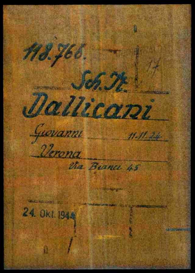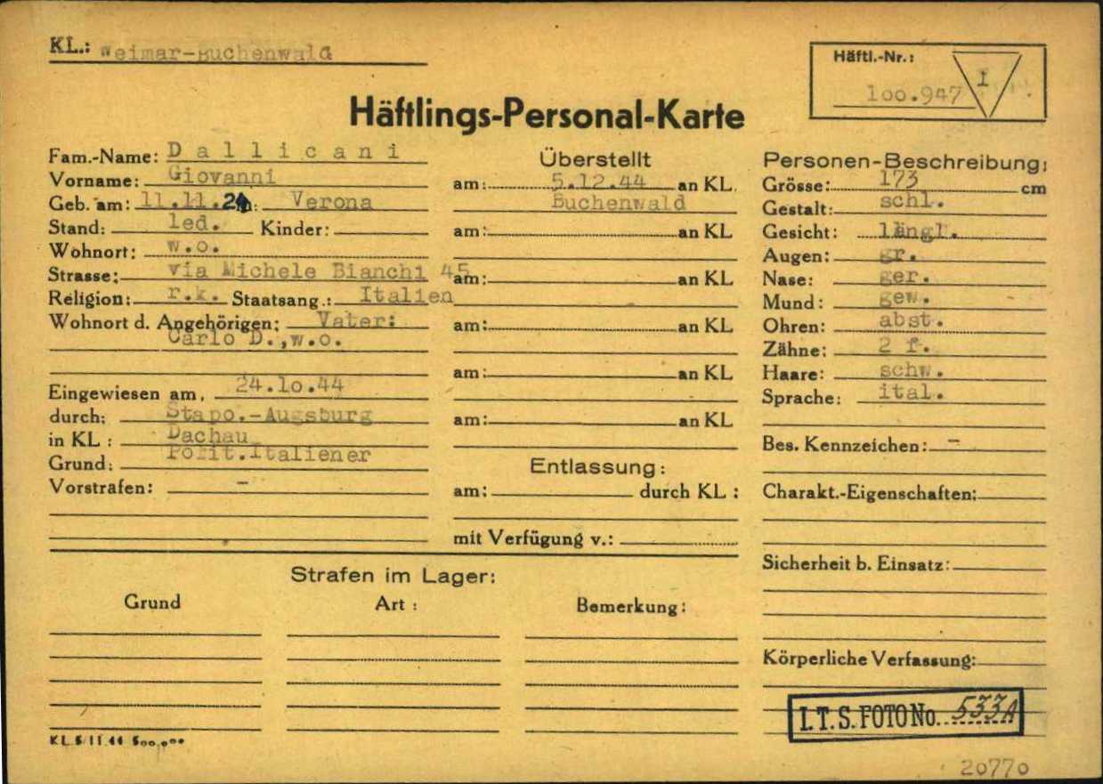 Dallicani Giovanni, figlio di Carlo e Pia Toccolini, nasce a Verona l’11 novembre 1924. Di mestiere riscaldatore di scambi ferroviari, risiede a Verona ed è celibe. Soldato di Cavalleria, viene arrestato a Augsburg (Germania) il 3 ottobre 1944. Su disposizione della Stapo di Augsburg (Staatspolizei – Polizia di stato), viene deportato nel Campo di concentramento di Dachau. All’arrivo, il 24 ottobre 1944, gli viene assegnato il numero di matricola 118766 e viene classificato come deportato per motivi precauzionali (SCH – Schutzhäftlinge). Il 4 dicembre 1944 viene trasferito a Buchenwald dove arriva il giorno successivo. Viene immatricolato con il numero 100947 e poi trasferito all’Aussenkommando S3 Olga (nome in codice di un progetto di tunnel per la costruzione di armi segrete – campo satellite di Buchenwald).