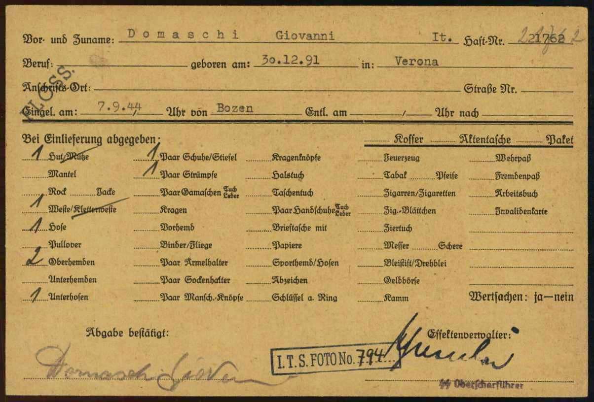 Documenti tratti da The Arolsen Archives online collections – 10852419 / Domaschi Gio Batta o Giovanni Battista (Flossenbürg).