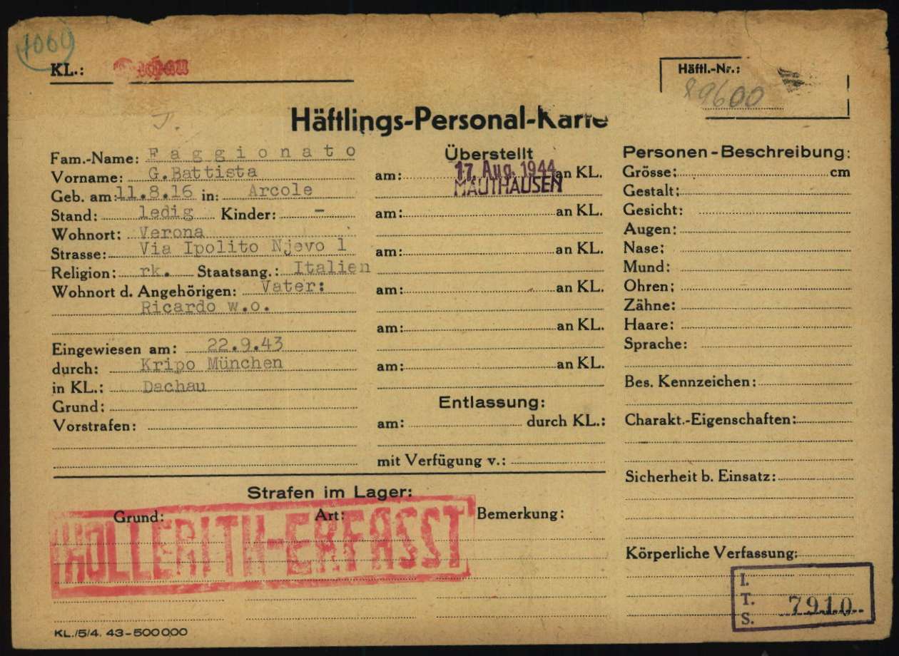 Documenti tratti da The Arolsen Archives online collections – 10036683 / Faggionato G. Battista (Dachau) e 1431170 / Faggionato G. Battista (Mauthausen).