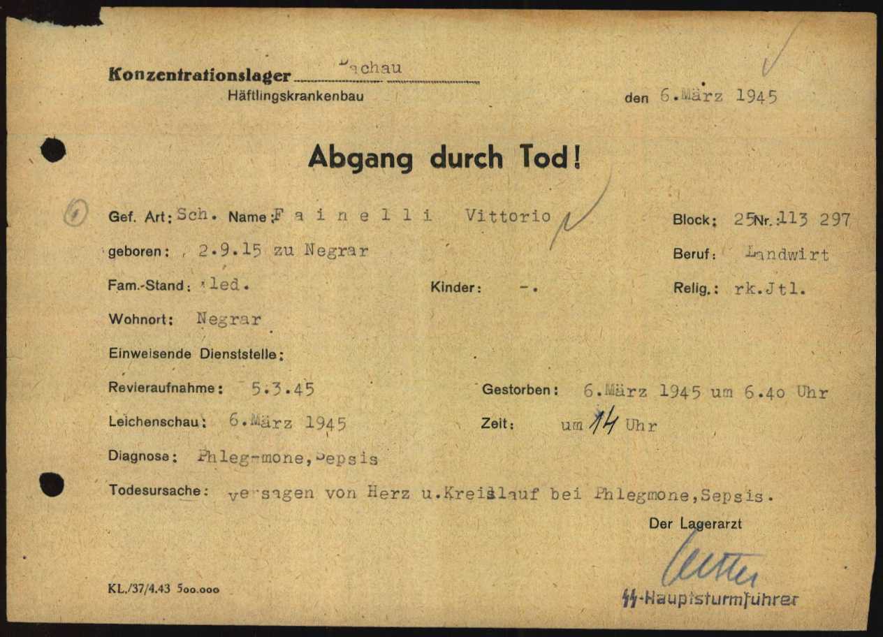Fainelli Vittorio, nasce a Negrar (Verona) il 2 settembre 1915. Di mestiere contadino, risiede a Negrar ed è celibe. Dopo l’arresto, viene trasferito nel Campo di concentramento e transito di Bolzano (Polizei – und Durchgangslager Bozen). Su disposizione del BDS di Verona (Befehlshaber der Sicherheitspolizei und des SD – Comandante della Polizia di Sicurezza e Servizi di Sicurezza), viene deportato nel Campo di concentramento di Dachau il 5 ottobre 1944 (trasporto n° 90). All’arrivo, il 9 ottobre 1944, gli viene dato il numero di matricola 113297, viene classificato come deportato per motivi precauzionali (SCH – Schutzhäftlinge) e assegnato al Blocco 25. Il 5 marzo 1945 viene ricoverato presso l’infermeria di Dachau (Revier). Muore a Dachau il 6 marzo 1945 e viene sepolto in fossa comune sul Leitenberg (Lager Friedhof – cimitero del campo di concentramento Dachau-Leitenberg).