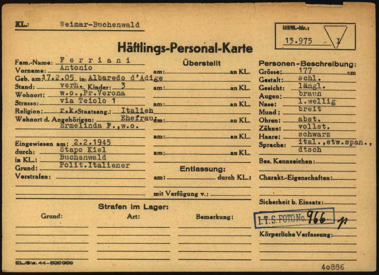 Ferriani Antonio, figlio di Giovanni e Maria Rossini, nasce ad Albaredo d’Adige (Verona) il 17 febbraio 1905. Di mestiere giardiniere ed interprete, risiede ad Albaredo. È coniugato con Ermelinda Guarise e padre di tre figli. Viene arrestato a Kiel (Germania) il 7 giugno 1944. Su disposizione della Stapo di Kiel (Staatspolizei – Polizia dello Stato), viene deportato nel Campo di concentramento di Buchenwald. All’arrivo, il 2 febbraio 1945, gli viene assegnato il numero di matricola 13975 e viene classificato come deportato per motivi politici (POL – Politisch). Muore in luogo e data ignoti.