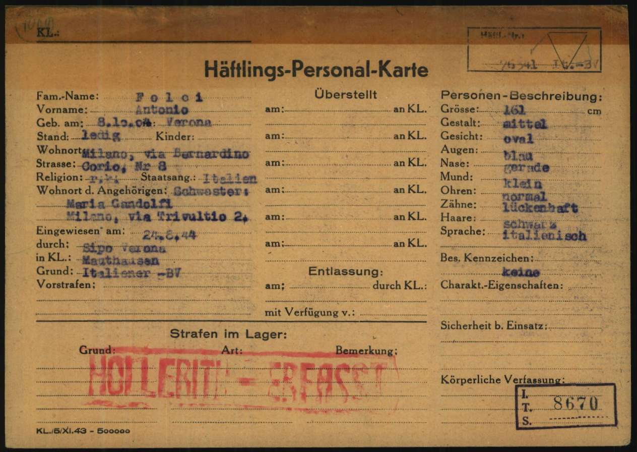 Folci Antonio, figlio di Francesco, nasce a Oppeano (Verona) l’8 ottobre 1904. Di mestiere manovale, risiede a Milano ed è celibe. Dopo l’arresto, viene trasferito nel Campo di concentramento e transito di Fossoli (Carpi – Modena). Su disposizione della Sipo di Verona (Sicherheitspolizei – Polizia di Sicurezza), viene deportato nel Campo di concentramento di Mauthausen sul convoglio partito da Fossoli il 21 giugno 1944 (trasporto n° 53). All’arrivo, il 24 giugno 1944, gli viene assegnato il numero di matricola 76341 e viene classificato come deportato perché reo abituale (BV – Berufbervrecher). Il 5 luglio 1944 viene trasferito a Wiener Neustadt (campo satellite di Mauthausen). Viene poi trasferito a Gusen – Steyr (campo satellite di Mauthausen). Muore a Gusen – Steyr il 15 aprile 1945.