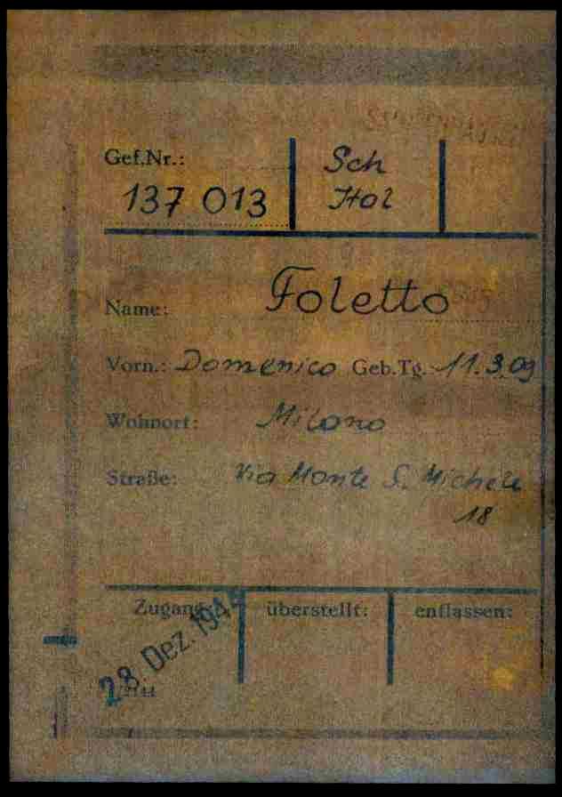 Foletto Domenico, nasce a Verona l’11 marzo 1909. Risiede a Milano e viene deportato nel Campo di concentramento di Dachau il 27 dicembre 1944. All’arrivo, il 28 dicembre 1944, gli viene assegnato il numero di matricola 137013 e viene classificato come deportato per motivi precauzionali (SCH – Schutzhäftlinge). Il 18 gennaio 1945 viene trasferito a Sachsenhausen.