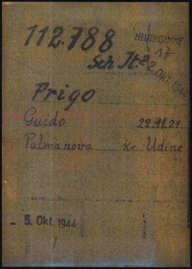Frigo Guido, nasce a Pressana (Verona) il 22 novembre 1921. Dopo l’arresto, viene deportato nel Campo di concentramento di Dachau sul convoglio partito da Trieste il 2 ottobre 1944 (altri deportati furono aggiunti a Udine e a Gorizia – trasporto n° 87). All’arrivo, il 5 ottobre 1944, gli viene assegnato il numero di matricola 112788 e viene classificato come deportato per motivi precauzionali (SCH – Schutzhäftlinge). Il 22 ottobre 1944 viene trasferito a Neuengamme.