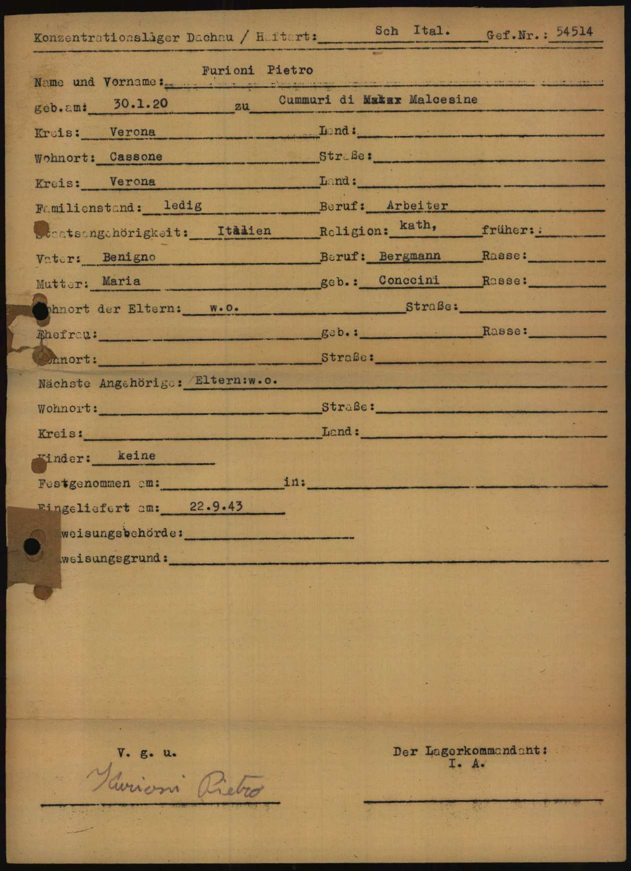 Furioni Pietro, figlio di Benigno e Maria Concini, nasce a Malcesine (Verona) il 30 gennaio 1920. Di mestiere operaio e falegname, risiede a Cassone – frazione di Malcesine (Verona) ed è celibe. Dopo l’arresto, viene detenuto nel Reclusorio militare di Peschiera del Garda (Verona). Su disposizione della Kripo di Monaco di Baviera (Kriminalpolizei – Polizia criminale), viene deportato nel Campo di concentramento di Dachau sul convoglio partito da Peschiera del Garda il 20 settembre 1943 (trasporto n° 2). All’arrivo, il 22 settembre 1943, gli viene dato il numero di matricola 54514, viene classificato come deportato ai lavori forzati (AZR – Arbeitszwang Reich) e viene assegnato, prima al Blocco 13 e poi al Blocco 25. Il 2 febbraio 1944 viene ricoverato presso l’infermeria di Dachau (Revier) e spostato al Blocco 8. Viene liberato dai soldati dell’Esercito americano a Dachau il 29 aprile 1945.