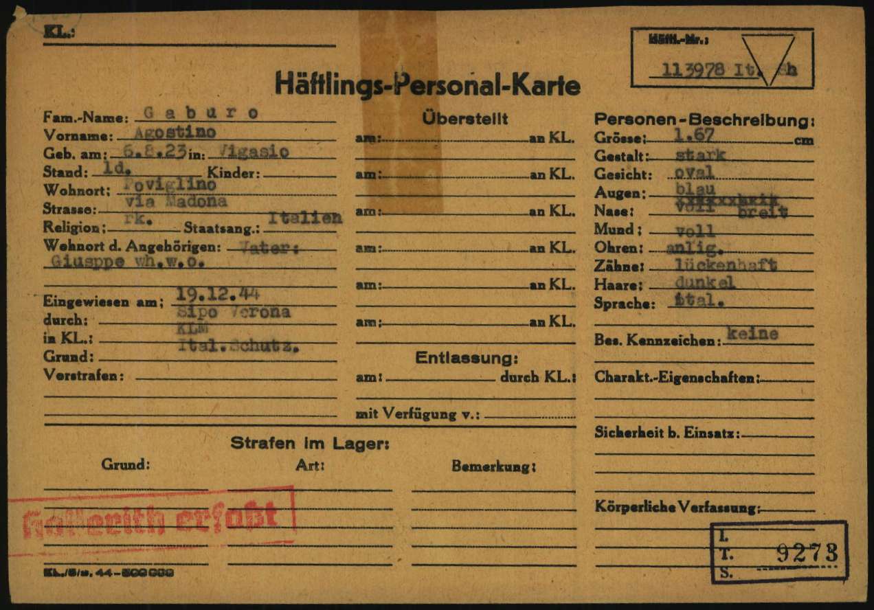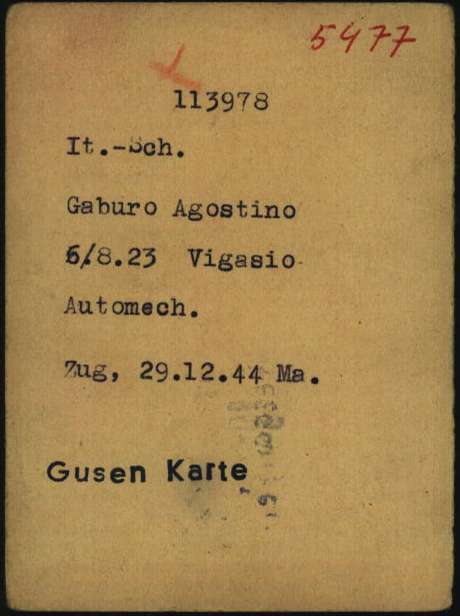 Gaburo Agostino, figlio di Giuseppe, nasce a Vigasio (Verona) il 6 agosto 1923. Di mestiere meccanico per auto, risiede a Povegliano (Verona) ed è celibe. Dopo l’arresto, su disposizione della Sipo di Verona (Sicherheitspolizei – Polizia di Sicurezza), viene deportato nel Campo di concentramento di Mauthausen sul convoglio partito da Verona il 18 dicembre 1944 (trasporto n° 110). All’arrivo, il 19 dicembre 1944, gli viene assegnato il numero di matricola 113978 e viene classificato come deportato per motivi precauzionali (SCH – Schutzhäftlinge). Il 29 dicembre 1944 viene trasfeito a Gusen (campo satellite di Mauthausen). Viene liberato.