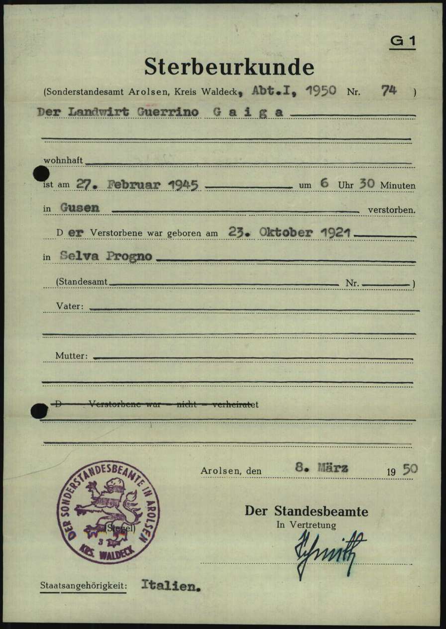Gaiga Guerrino, figlio di Cristiano, nasce a Selva di Progno (Verona) il 23 ottobre 1921. Di mestiere lavoratore agricolo, viene arrestato a Selva di Progno e poi trasferito nel Campo di concentramento e transito di Fossoli (Carpi – Modena). Su disposizione del SD di Verona (Sicherheitsdienst – Servizio di Sicurezza delle SS), viene deportato nel Campo di concentramento di Mauthausen sul convoglio partito da Fossoli il 21 giugno 1944 (trasporto n° 53). All’arrivo, il 24 giugno 1944, gli viene assegnato il numero di matricola 76347 e viene classificato come deportato per motivi precauzionali (SCH – Schutzhäftlinge). Viene poi trasferito a Groß Raming (campo satellite di Mauthausen) e succesivamente a Schlier (campo satellite di Mauthausen). Infine viene trasferito a Gusen (campo satellite di Mauthausen). Muore a Gusen il 27 febbraio 1945 e viene sepolto nella stessa località in fossa comune.