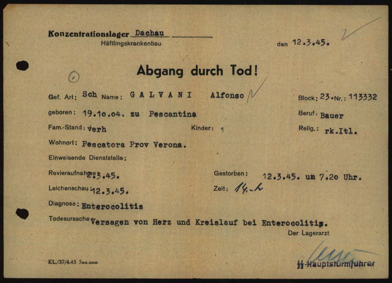 Galvani Alfonso, nasce a Pescantina (Verona) il 19 ottobre 1904. Di mestiere contadino, risiede a Pescantina, è coniugato e padre di un figlio. Dopo l’arresto, viene trasferito nel Campo di concentramento e transito di Bolzano (Polizei – und Durchgangslager Bozen). Su disposizione del BDS di Verona (Befehlshaber der Sicherheitspolizei und des SD – Comandante della Polizia di Sicurezza e Servizi di Sicurezza), viene deportato nel Campo di concentramento di Dachau il 5 ottobre 1944 (trasporto n° 90). All’arrivo, il 9 ottobre 1944, gli viene dato il numero di matricola 113332, viene classificato come deportato per motivi precauzionali (SCH – Schutzhäftlinge) e viene assegnato al Blocco 23. Il 2 marzo 1945 viene ricoverato presso l’infermeria di Dachau (Revier). Muore a Dachau il 12 marzo 1945 e viene sepolto in fossa comune sul Leitenberg (Lager Friedhof – cimitero del campo di concentramento Dachau-Leitenberg).