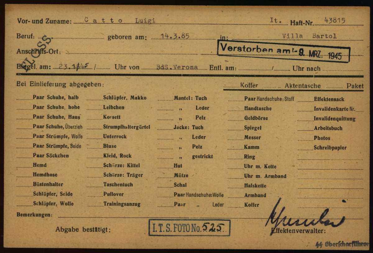 Documenti tratti da The Arolsen Archives online collections – 10839229 / Gatto (Catto) Luigi (Flossenbürg).
