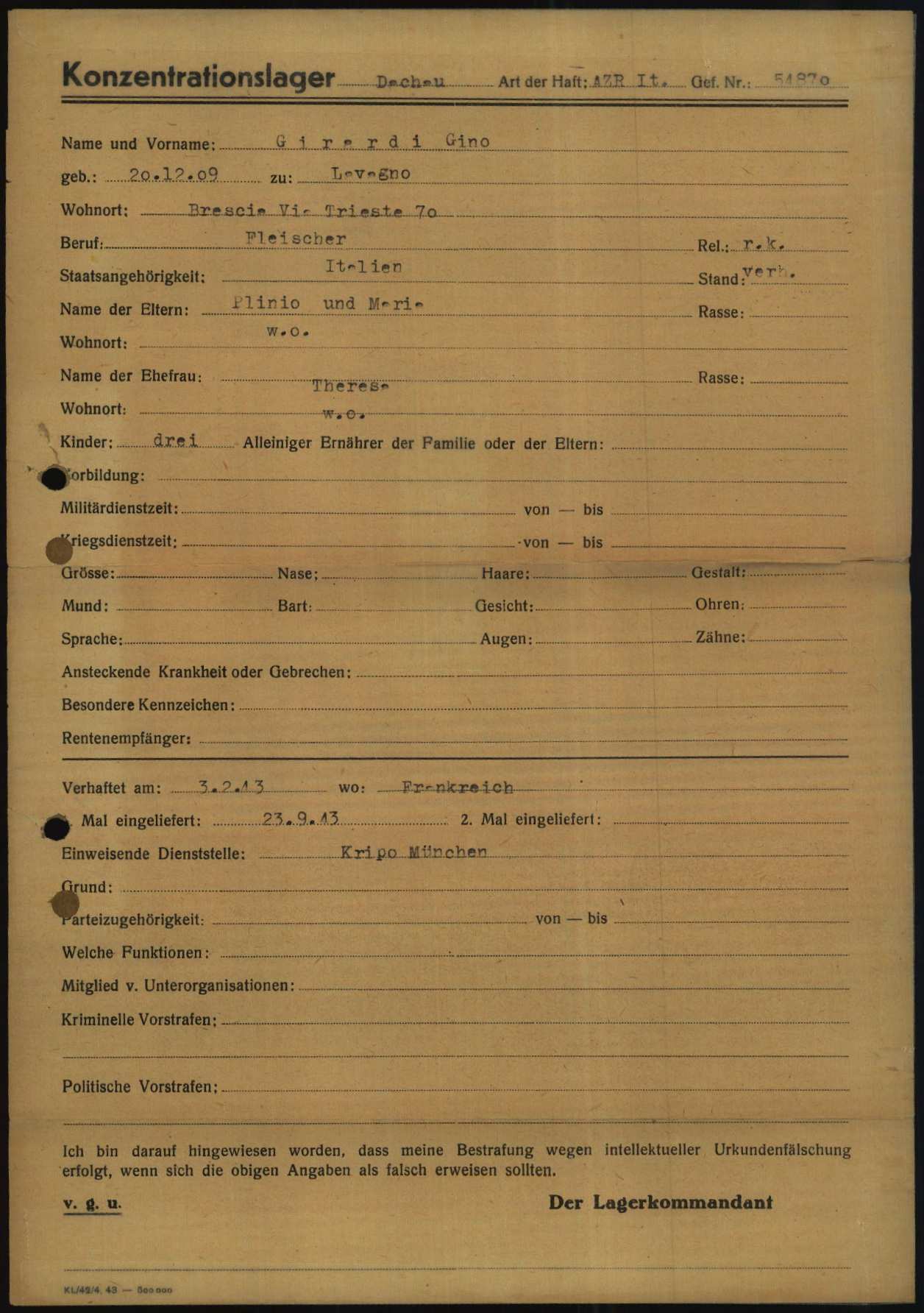 Girardi Gino, figlio di Plinio e Maria, nasce a Lavagno (Verona) il 20 dicembre 1909. Di mestiere macellaio, risiede a Brescia, è coniugato con Teresa (?) e padre di tre figli. Viene arrestato in Francia il 3 febbraio 1943. Detenuto nel Reclusorio militare di Peschiera del Garda (Verona). Su disposizione della Kripo di Monaco di Baviera (Kriminalpolizei – Polizia criminale), viene deportato nel Campo di concentramento di Dachau sul convoglio partito da Peschiera del Garda il 20 settembre 1943 (trasporto n° 2). All’arrivo, il 22 settembre 1943, gli viene assegnato il numero di matricola 54870 e viene classificato come deportato ai lavori forzati (AZR – Arbeitszwang Reich). Viene liberato dai soldati dell’Esercito americano a Dachau il 29 aprile 1945.