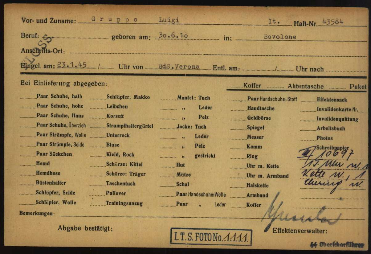 Gruppo Luigi, figlio di Alberico e Molesani Fulvia, nasce a Bovolone (Verona) il 30 giugno 1910. Di mestiere macellaio, è coniugato con Adalgisa Caliari. Partigiano combattente della Brigata “Anita” e membro del Comitato di Liberazione Nazionale di Isola della Scala, viene arrestato dai fascisti (Brigate Nere) assieme alla Gendarmeria tedesca il 22 novembre 1944 a Isola della Scala (Verona). Detenuto a Verona, viene poi trasferito nel Campo di concentramento e transito di Bolzano (Polizei – und Durchgangslager Bozen). Su disposizione del BDS di Verona (Befehlshaber der Sicherheitspolizei und des Sicherheitsdienstes – Comandante della Polizia di Sicurezza e Servizi di Sicurezza), viene deportato nel Campo di concentramento di Flossenbürg il 19 gennaio 1945 (trasporto n° 118). All’arrivo, il 23 gennaio 1945, gli viene assegnato il numero di matricola 43584 e viene classificato come deportato per motivi politici (POL – Politisch). Il 3 febbraio 1945 viene trasferito a Porschdorf (campo satellite di Flossenbürg). Viene poi trasferito a Leitmeritz (campo satellite di Flossenbürg). Successivamente viene trasferito a Theresienstadt. All’arrivo, il 21 aprile 1945, gli viene dato il numero di matricola 2337011 e gli viene assegnata la categoria di deportato per motivi politici (POL – Politisch). Liberato dai russi l’8 maggio 1945, viene ricoverato in un ospedale in Cecoslovacchia fino al 16 agosto 1945, giorno in cui viene rimpatriato dalla Croce Rossa.