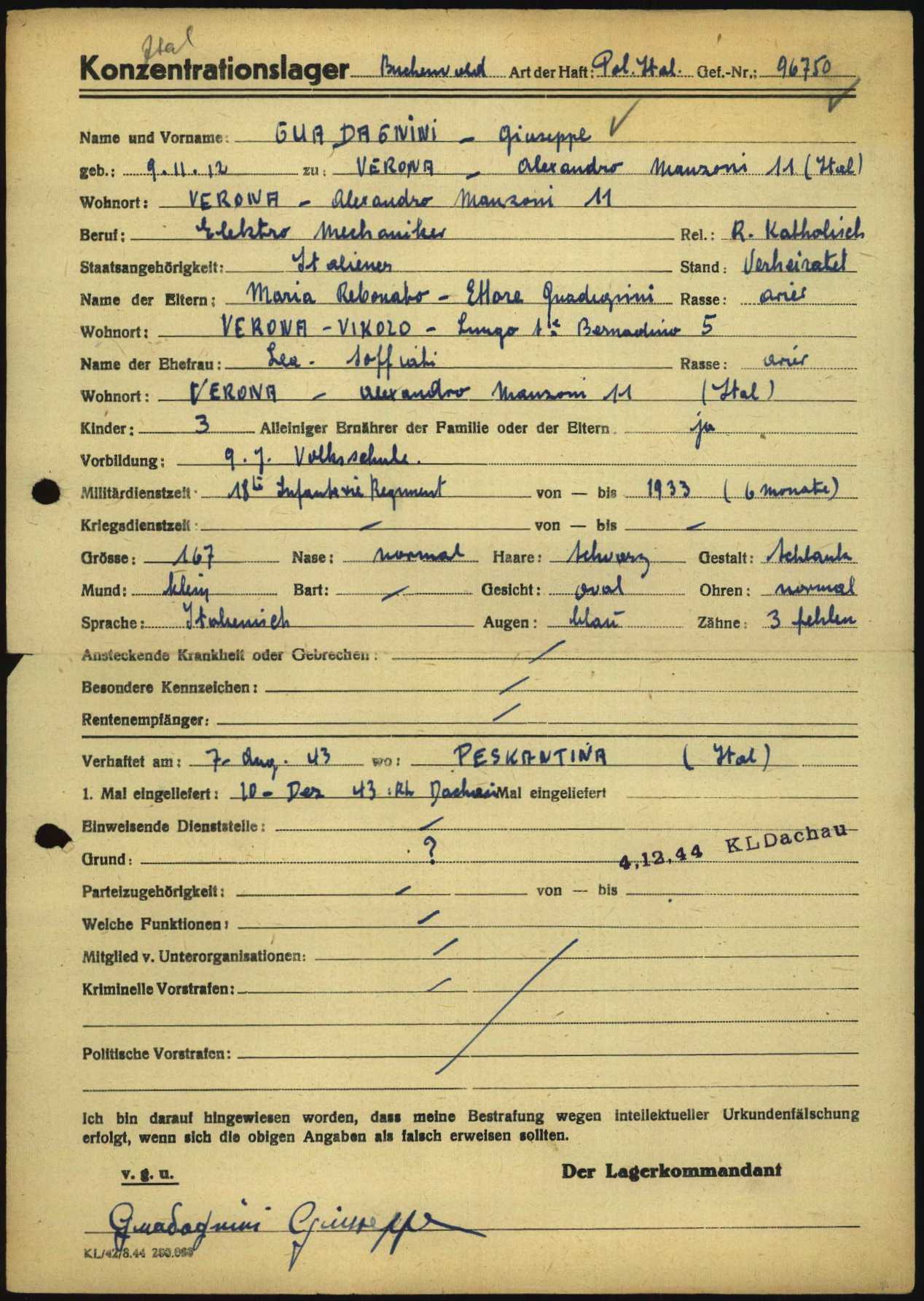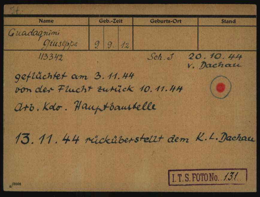 Guadagnini Giuseppe, figlio di Ettore e Maria Rebonato, nasce a Isola della Scala (Verona) il 9 novembre 1912. Di mestiere elettro meccanico, risiede a Verona, è coniugato con Soffiati Lea e padre di tre figli. Viene arrestato a Pescantina (Verona) il 7 agosto 1943 e detenuto, prima a Forte San Mattia e poi presso il Palazzo INA (sede del Comando Generale SS e Polizia di Sicurezza – Befehlshaber der Sicherheitspolizei und des Sicherheitsdienst / B.d.S Italien). Viene successivamente trasferito nel Campo di concentramento e transito di Bolzano (Polizei – und Durchgangslager Bozen). Su disposizione del BDS di Verona (Befehlshaber der Sicherheitspolizei und des SD – Comandante della Polizia di Sicurezza e Servizi di Sicurezza), viene deportato nel Campo di concentramento di Dachau il 5 ottobre 1944 (trasporto n° 90). All’arrivo, il 9 ottobre 1944, gli viene assegnato il numero di matricola 113342 e viene classificato come deportato per motivi precauzionali (SCH – Schutzhäftlinge). Il 6 novembre 1944 riesce a fuggire dal campo. Viene catturato e riportato a Dachau il 13 novembre 1944 dove gli viene assegnata la categoria di deportato per motivi politici (POL – Politisch). Viene infine trasferito a Langensalza (campo satellite di Buchenwald) il 17 novembre 1944. All’arrivo, il 4 dicembre 1944, gli viene assegnato il numero di matricola 96750. Viene liberato a Langensalza il 1° aprile 1945.