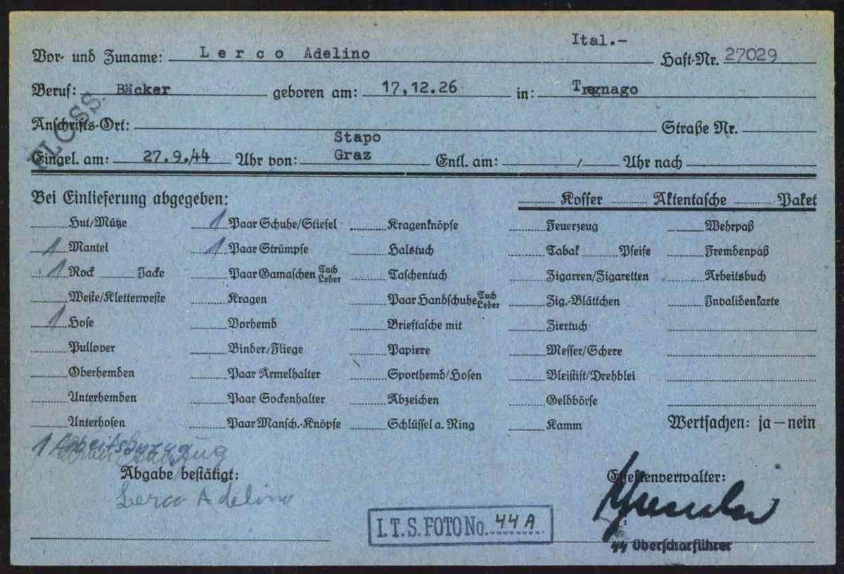Lerco Adelino nasce a Tregnago (Verona) il 17 dicembre 1926. Di mestiere panettiere. Dopo l’arresto, su disposizione della Stapo di Graz – Austria – (Staatspolizei – Polizia dello Stato), viene deportato nel Campo di concentramento di Flossenbürg. All’arrivo, il 27 settembre 1944, gli viene assegnato il numero di matricola 27029 e viene classificato come lavoratore civile (ZA – Zivilarbeiter). Viene liberato.