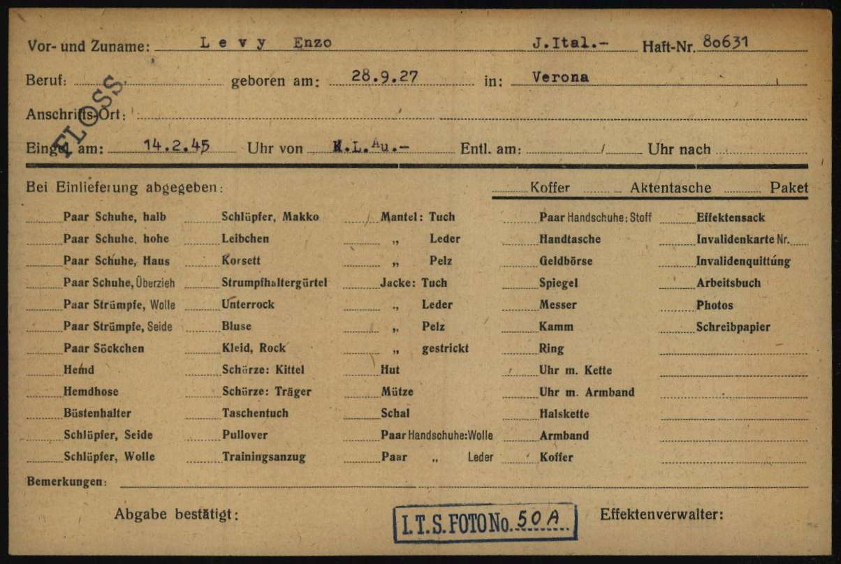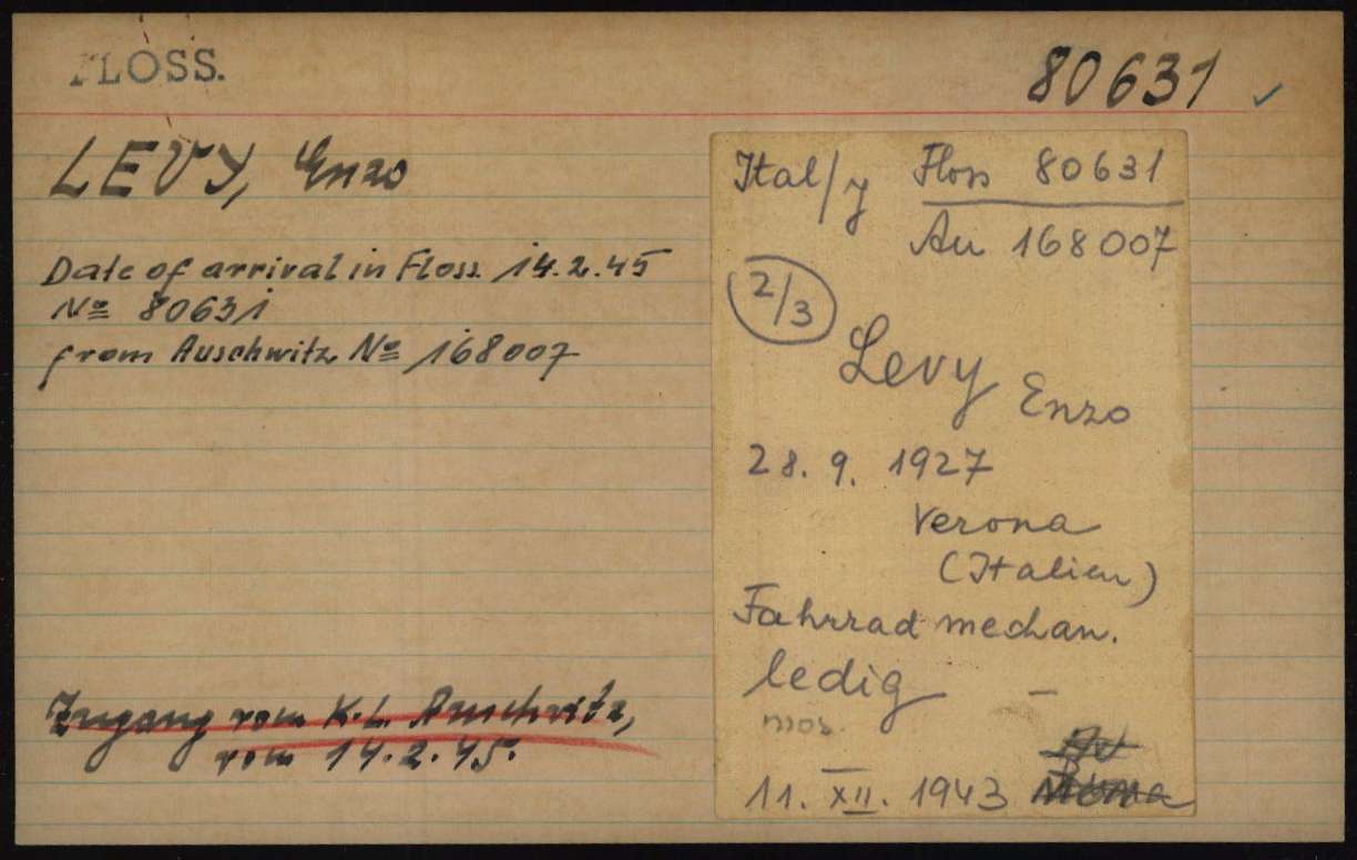 Levy Enzo, figlio di Edgardo e Egle Segre, nasce a Verona il 28 settembre 1922. Di mestiere meccanico di biciclette, risiede a Torino ed è celibe. Viene arrestato a Tradate (Varese) il 12 novembre 1943. Detenuto a Milano, viene poi deportato nel Campo di concentramento di Auschwitz il 6 dicembre 1943 (convoglio partito da Milano e Verona – trasporto n° 12). All’arrivo, l’11 dicembre 1943, gli viene assegnato il numero di matricola 168007. Viene poi trasferito a Flossenbürg, dove arriva il 14 febbraio 1945. Gli viene assegnato il numero 80631. Viene liberato.