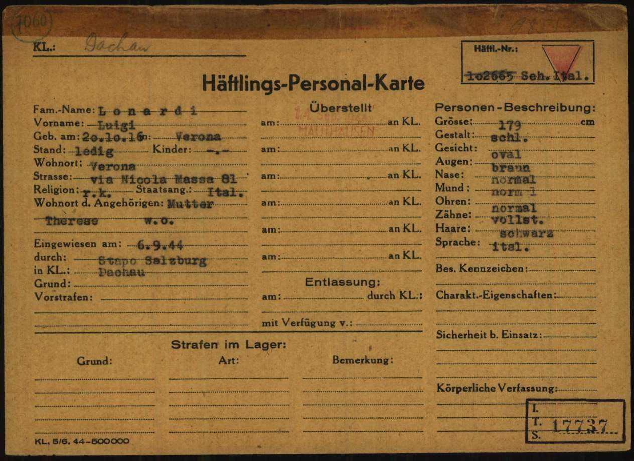Lonardi o Leonardi Luigi, figlio di Santi Teresa, nasce a Verona il 20 ottobre 1916. Di mestiere fornaio, risiede a Verona ed è celibe. Su disposizione della Stapo di Salisburgo – Austria – (Staatspolizei – Polizia di stato), viene deportato nel Campo di concentramento di Dachau sul convoglio partito da Trieste il 4 settembre 1944 (trasporto n° 136). All’arrivo, il 6 settembre 1944, gli viene assegnato il numero di matricola 102665 e viene classificato come deportato per motivi precauzionali (SCH – Schutzhäftlinge). Viene poi trasferito a Mauthausen, dove arriva il 14 settembre 1944. Viene immatricolato con il numero 98553. Il 21 settembre 1944 viene trasferito a Melk-Quarz (campo satellite di Mauthausen). Viene infine ricoverato presso l’infermeria di Mauthausen (Revier) l’11 aprile 1945.