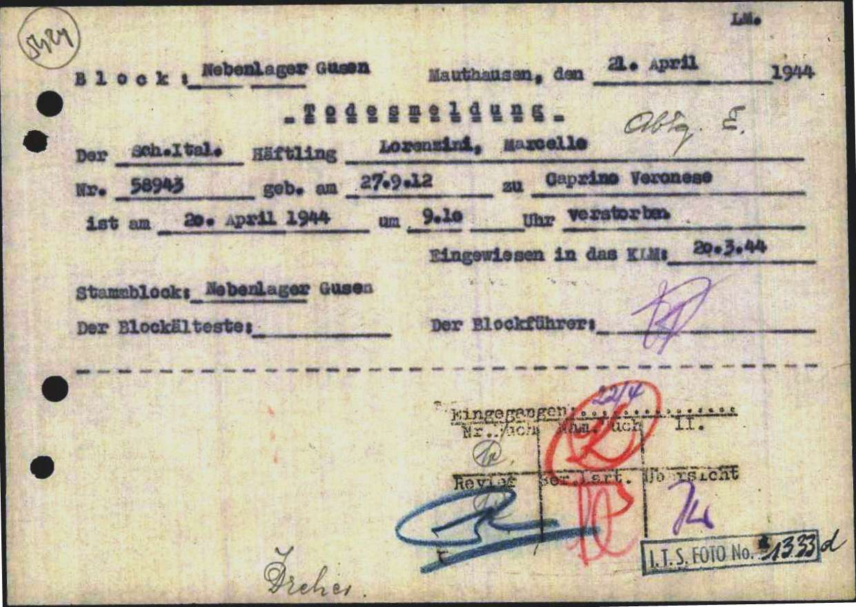 Lorenzini Marcello, figlio di Silvio, nasce a Caprino Veronese (Verona) il 27 settembre 1912. Di mestiere tornitore, viene arrestato a Sesto San Giovanni (Milano) il 14 marzo 1944. Su disposizione del SD di Verona (Sicherheitsdienst – Servizio di Sicurezza delle SS), viene deportato nel Campo di concentramento di Mauthausen sul convoglio partito da Bergamo il 16 marzo 1944 (trasporto n° 34). All’arrivo, il 20 marzo 1944, gli viene assegnato il numero di matricola 58943 e viene classificato come deportato per motivi precauzionali (SCH – Schutzhäftlinge). Viene poi trasferito a Gusen (campo satellite di Mauthausen). Muore a Gusen il 20 aprile 1944 e viene sepolto nella stessa località in fossa comune.