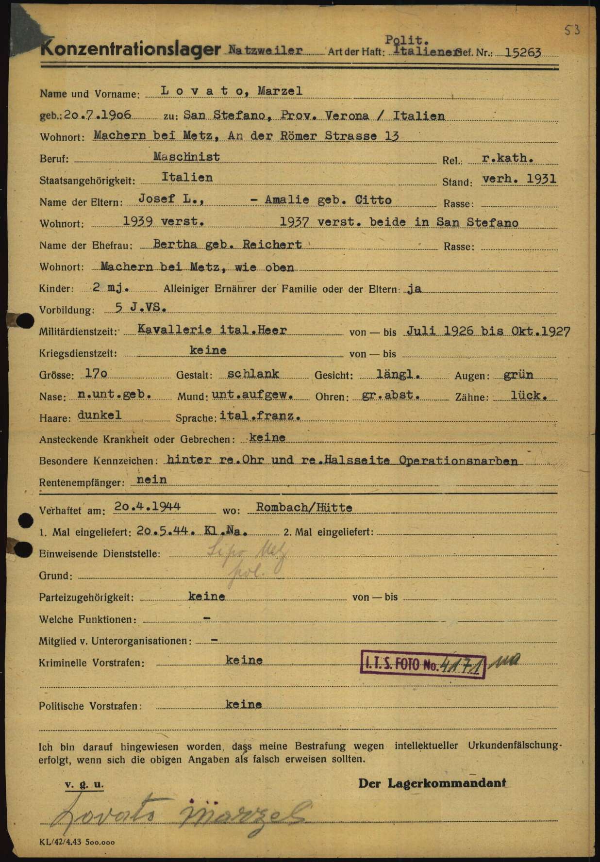 Note: nei documenti di Natzweiler il nome riportato è Marzel. Gli stessi documenti vengono firmati dal prigioniero come Lovato Marzel.