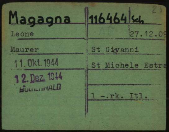 Magagna Leone, figlio di Gaetano e Carolina Favalli, nasce a San Giovanni Lupatoto (Verona) il 27 dicembre 1909. Di mestiere fornaio, risiede a San Michele Extra (Verona) ed è celibe. Viene deportato nel Campo di concentramento di Dachau. All’arrivo, l’11 ottobre 1944, gli viene assegnato il numero di matricola 116464 e viene classificato come deportato per motivi precauzionali (SCH – Schutzhäftlinge). Mestiere assegnato nel campo: manovale. Viene poi trasferito a Buchenwald, dove arriva il 13 dicembre 1944. Viene immatricolato con il numero 39675 e gli viene assegnata la categoria di deportato per motivi politici (POL – Politisch). Viene poi trasferito all’Aussenkommando S3 Olga (nome in codice di un progetto di tunnel per la costruzione di armi segrete – campo satellite di Buchenwald) il 20 dicembre 1944, e immatricolato con il numero 109649. Viene poi trasferito a Ohrdruf (campo satellite di Buchenwald) il 15 gennaio 1945. Infine, viene trasferito a Weimar (campo satellite di Buchenwald). Muore a Buchenwald-Weimar il 9 febbraio 1945 e viene sepolto nel cimitero del campo di concentramento in fossa comune (Buchenwald – KZ Friedhof).