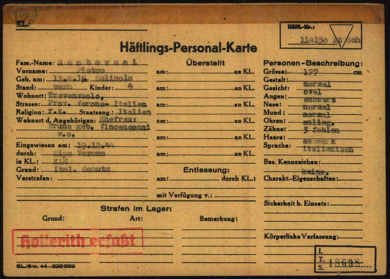 Mantovani Pietro, nasce a Salizzole (Verona) il 12 aprile 1915. Di mestiere stradino e lavoratore agricolo. Risiede a Trevenzuolo (Verona), è coniugato con Bruna Vincenzoni ed è padre di quattro figli. Viene arrestato a Trevenzuolo il 20 novembre 1944 e detenuto, prima presso il Comando delle Brigate Nere (Scuole Sanmicheli) e poi presso il Palazzo INA (sede del Comando Generale SS e Polizia di Sicurezza – Befehlshaber der Sicherheitspolizei und des Sicherheitsdienst / B.d.S Italien). Viene successivamente trasferito nel Campo di concentramento e transito di Bolzano (Polizei – und Durchgangslager Bozen). Su disposizione della Sipo di Verona (Sicherheitspolizei – Polizia di Sicurezza), viene deportato nel Campo di concentramento di Mauthausen il 14 dicembre 1944 (trasporto n° 111). All’arrivo, il 19 dicembre 1944, gli viene assegnato il numero di matricola 114150 e viene classificato come deportato per motivi precauzionali (SCH – Schutzhäftlinge). Il 23 dicembre 1944 viene ricoverato presso l’infermeria di Mauthausen (Revier), da dove viene dimesso il 28 dicembre 1944. Viene infine trasferito a Melk-Quarz (campo satellite di Mauthausen) il 3 gennaio 1945. Viene liberato dai soldati dell’Esercito americano a Mauthausen il 5 maggio 1945. Riempatriato il 29 luglio 1945.