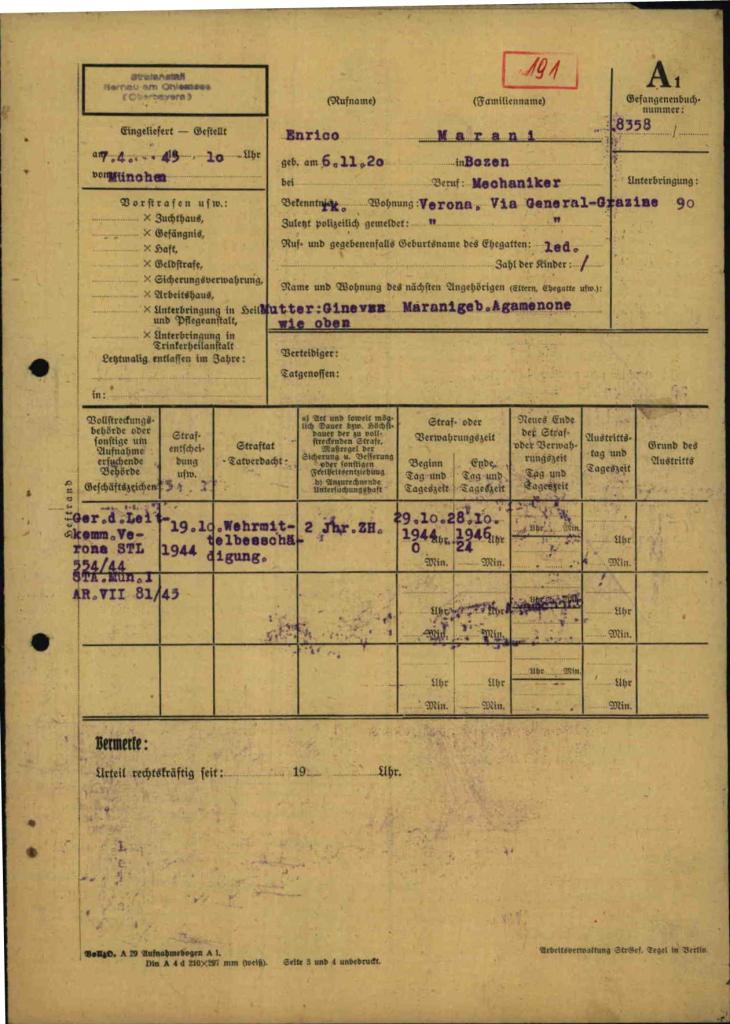 Marani Enrico, figlio di Domenico e Ginevra Agamennone, nasce a Bolzano il 6 novembre 1920. Di mestiere meccanico (motorista aeronautico), risiede a Verona. Nel 1944 partecipa a diverse missioni di sabotaggio (tra le quali la Missione RYE). Viene arrestato il 20 ottobre 1944 e detenuto nel Forte di Santa Sofia. Viene poi processato e condannato a 2 anni di reclusione per danneggiamento ai mezzi di difesa tedeschi. Nel gennaio del 1945, viene deportato nel Penitenziario di Bernau am Chiemsee (prigione e campo di lavoro). Matricola 8358. Liberato, viene rimpatriato il 3 luglio 1945.