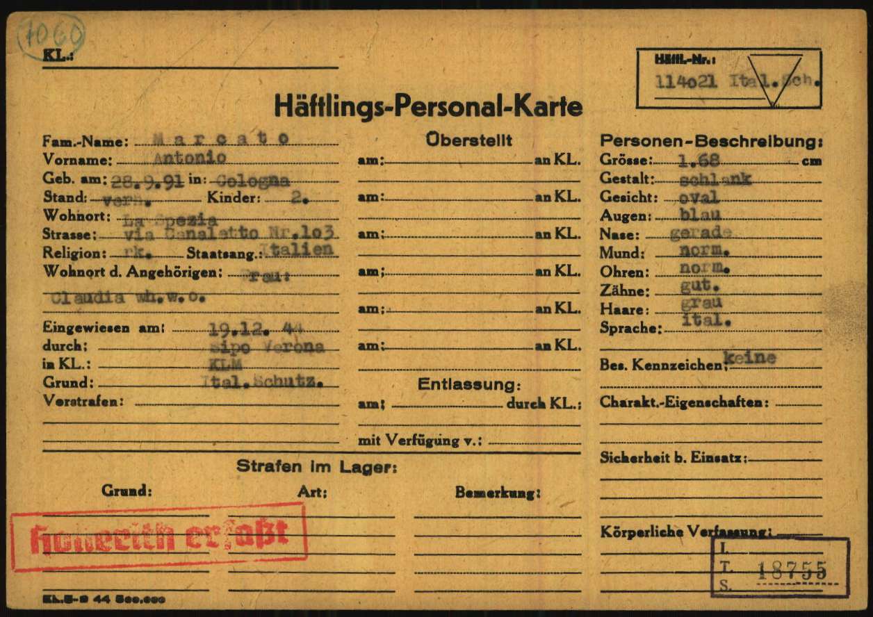 Marcato Antonio, figlio di Carlo, nasce a Cologna Veneta (Verona) il 28 settembre 1891. Di mestiere meccanico, risiede a La Spezia ed è coniugato con Claudia (?). Viene arrestato a La Spezia il 19 settembre 1944. Detenuto a Genova, viene poi trasferito nel Campo di concentramento e transito di Bolzano (Polizei – und Durchgangslager Bozen). Su disposizione della Sipo di Verona (Sicherheitspolizei – Polizia di Sicurezza), viene deportato nel Campo di concentramento di Mauthausen il 14 dicembre 1944 (trasporto n° 111). All’arrivo, il 19 dicembre 1944, gli viene assegnato il numero di matricola 114021 e viene classificato come deportato per motivi precauzionali (SCH – Schutzhäftlinge). Il 29 dicembre 1944 viene trasferito a Gusen III (campo satellite di Mauthausen). Muore a Gusen il 12 aprile 1945 e viene sepolto nella stessa località in fossa comune.