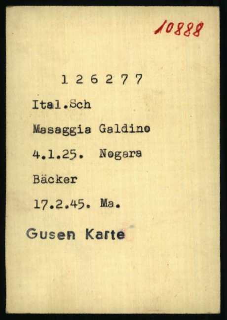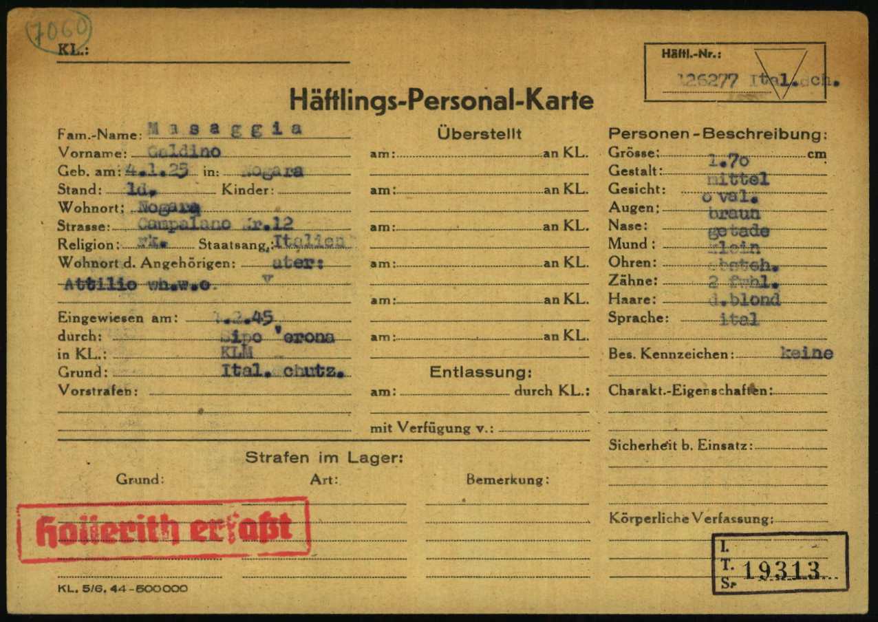 Documenti tratti da The Arolsen Archives online collections – 1617614 / Masaggia o Massaggia o Massaglia Galdino (Mauthausen) e da The Arolsen Archives online collections – 1617616 / Masaggia o Massaggia o Massaglia Galdino (Gusen).